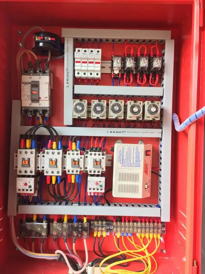 Relay trung gian, Timer, Nút nhấn, Đèn báo, ...